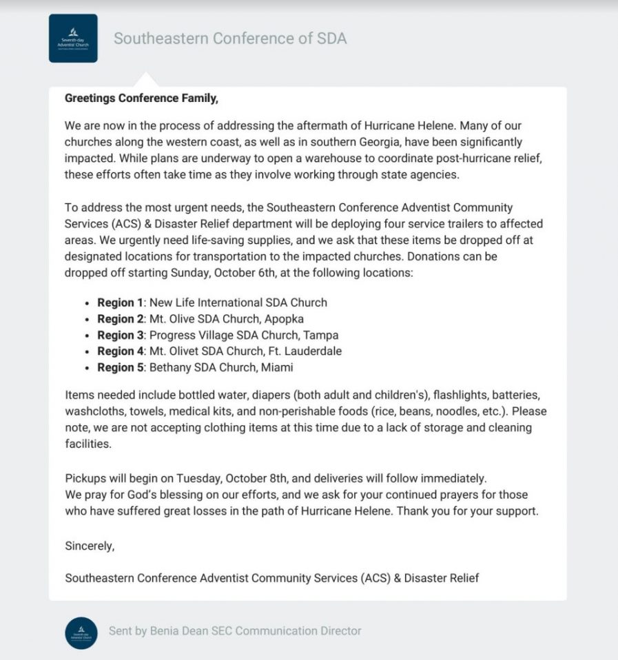 Hurricane Helene has impacted churches along the western coast and southern Georgia. To address urgent needs, the Southeastern Conference Adventist Community Services (ACS) & Disaster Relief is deploying service trailers to affected areas.
